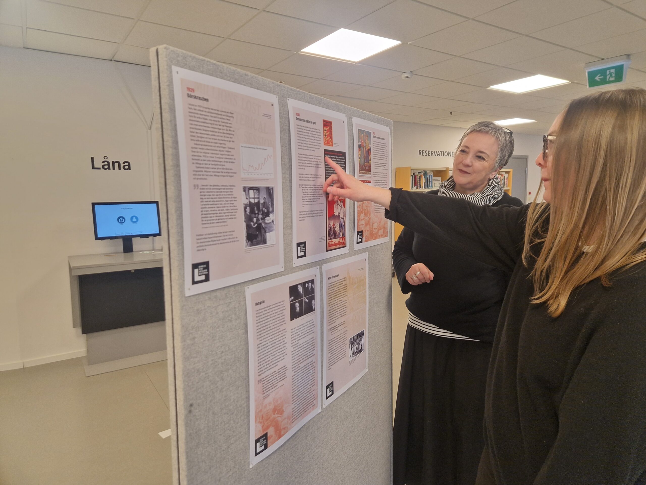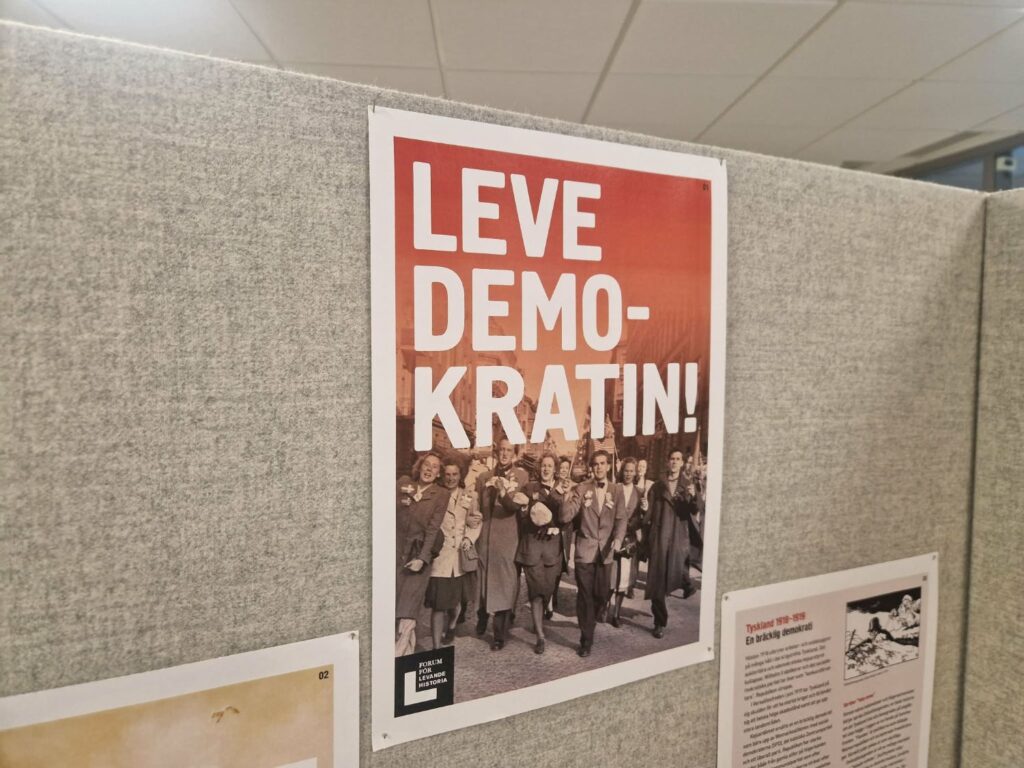 Mellan bokhyllor och studiebord på Jakobsbergs bibliotek hänger affischer med demokratiska slagord. Det är en del av den nya utställningen som skildrar hur diktaturen tog fäste i trettiotalets Tyskland. Syftet är att belysa vikten av demokrati – men även hur den kan sättas ur spel, försvagas eller avskaffas.