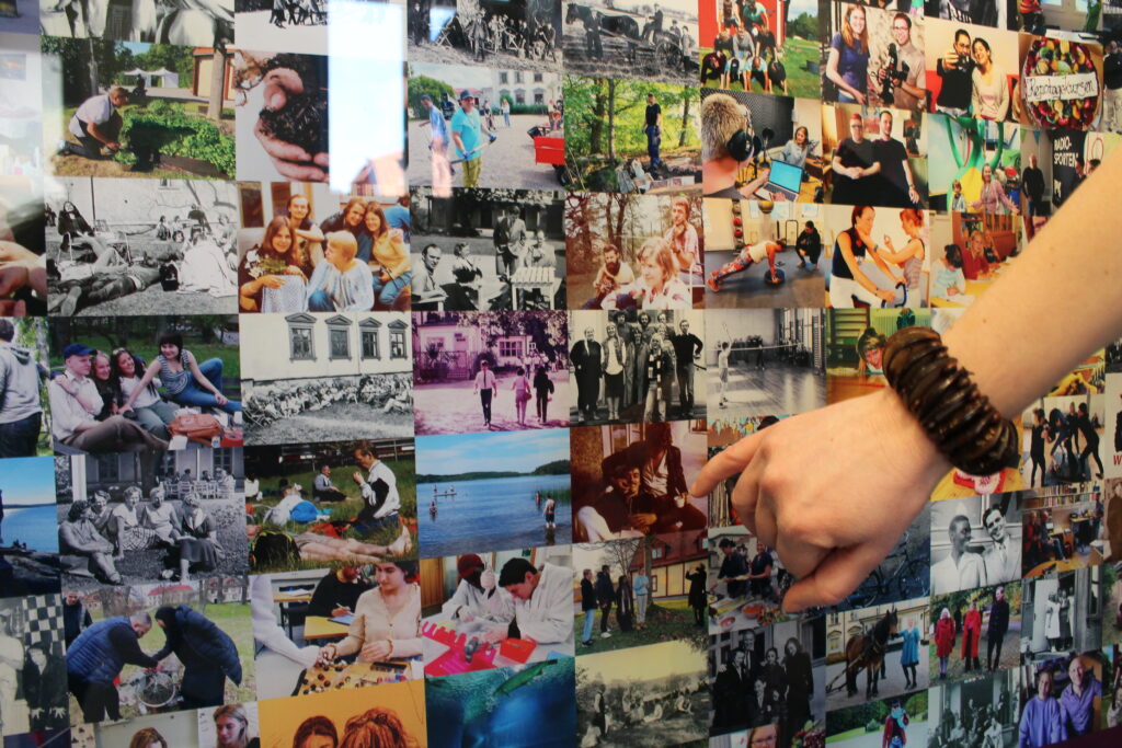 Förutom en 450 år gammal ek finns där ett stort antal olika lövträd och för att skapa ett av verken samlade Therese Jonsson Szatek därför in löv som hon sen fotograferade. I det collaget finns också bilderna av paret som grundade skolan år 1919 och några som visar hur livet på gården såg ut då. Och det är sig likt – fokuset på hälsa, kunskap och gemenskap står fast.